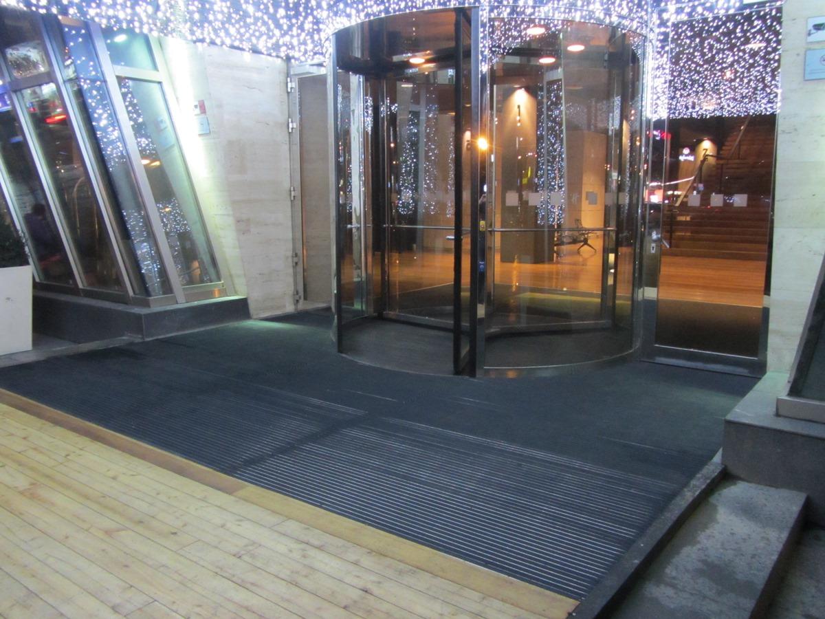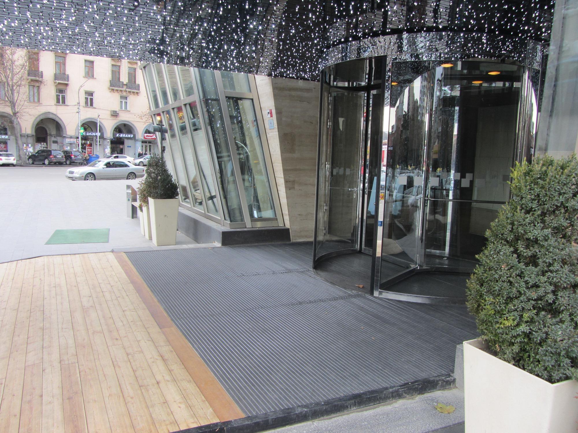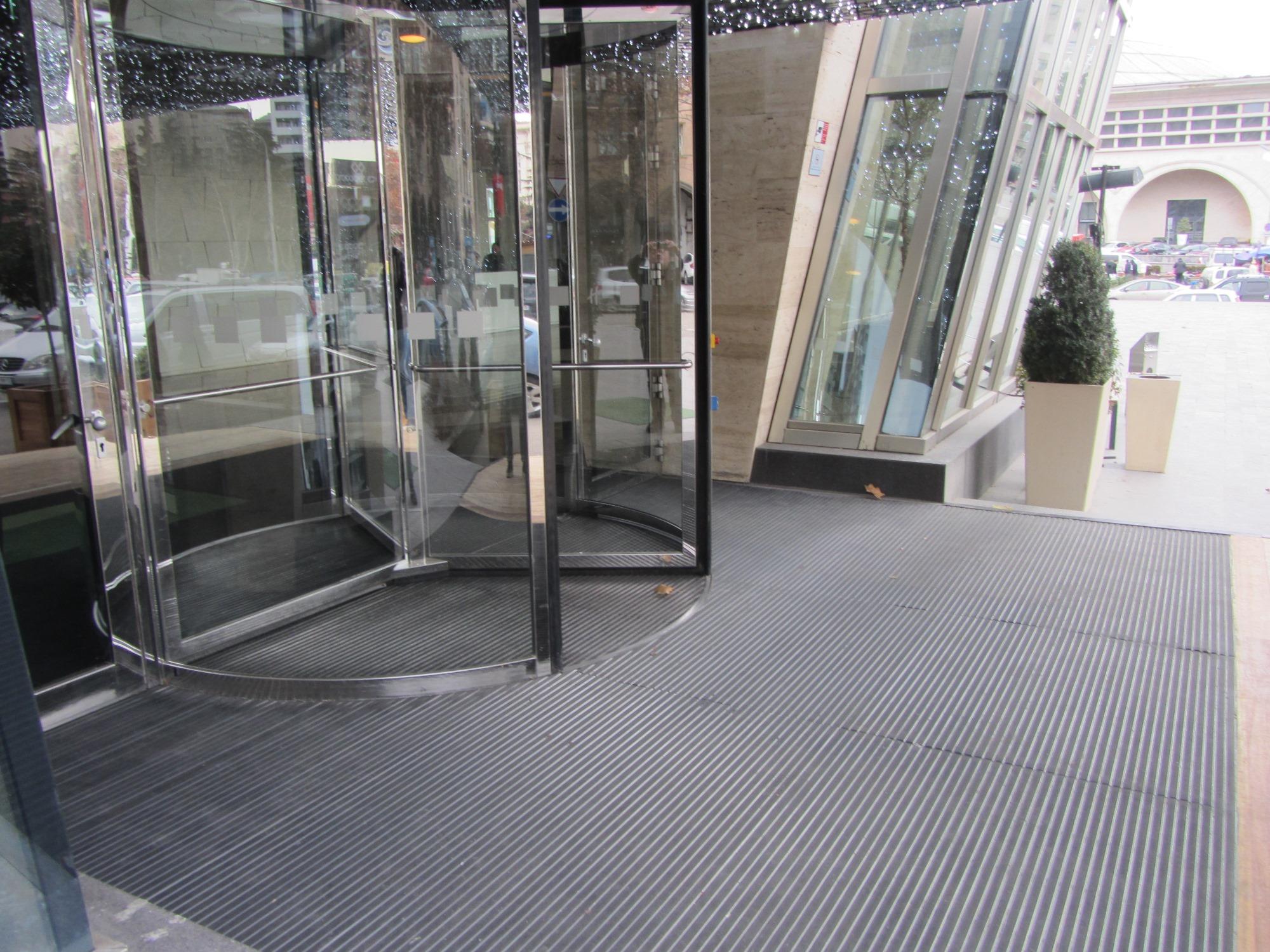 ცენტრალური შესასვლელის გარე პერიმეტრზე დაიგო ფეხსაწმენდი სისტემა EMCO Diplomat 517G რეზინის ჩანართებით.