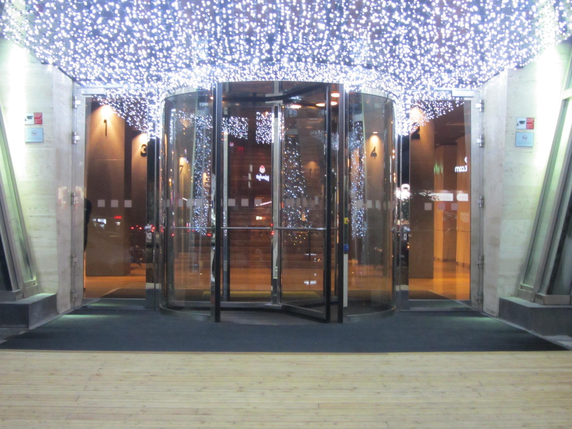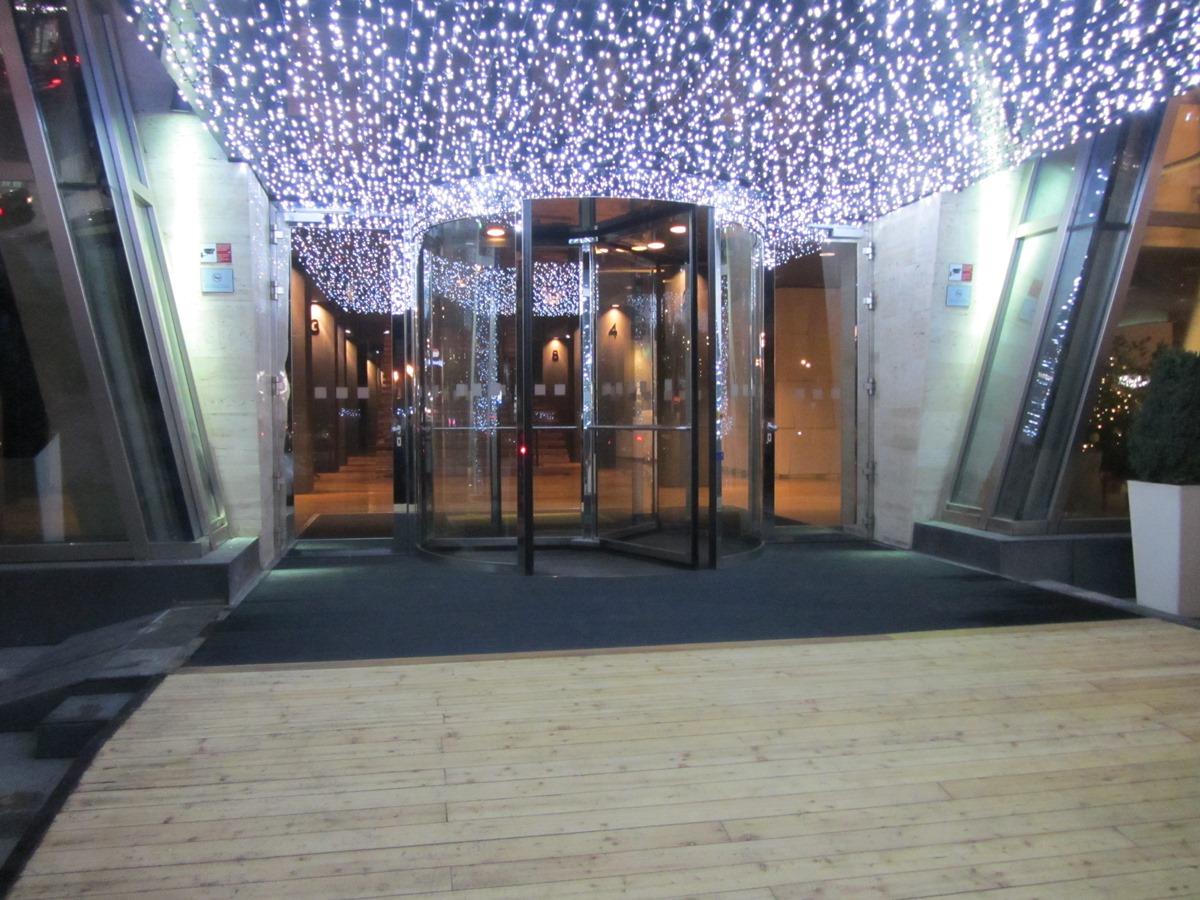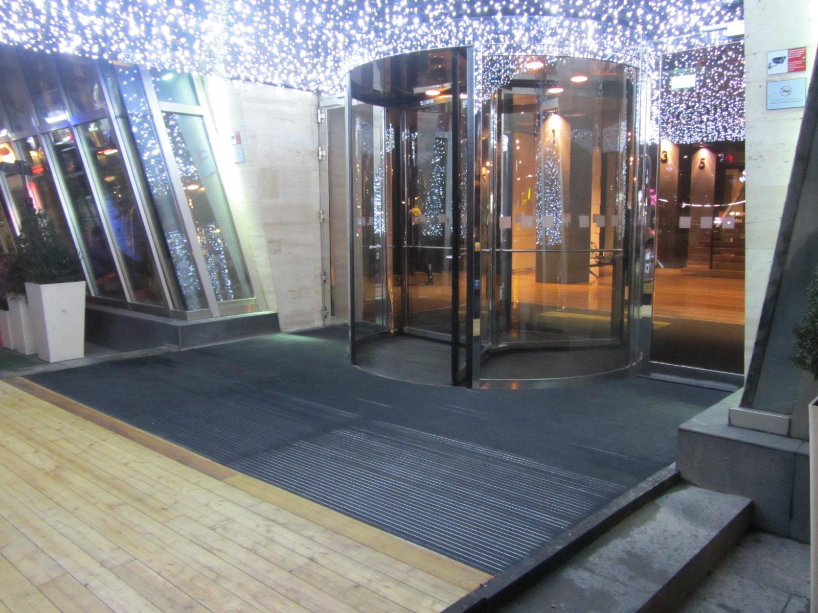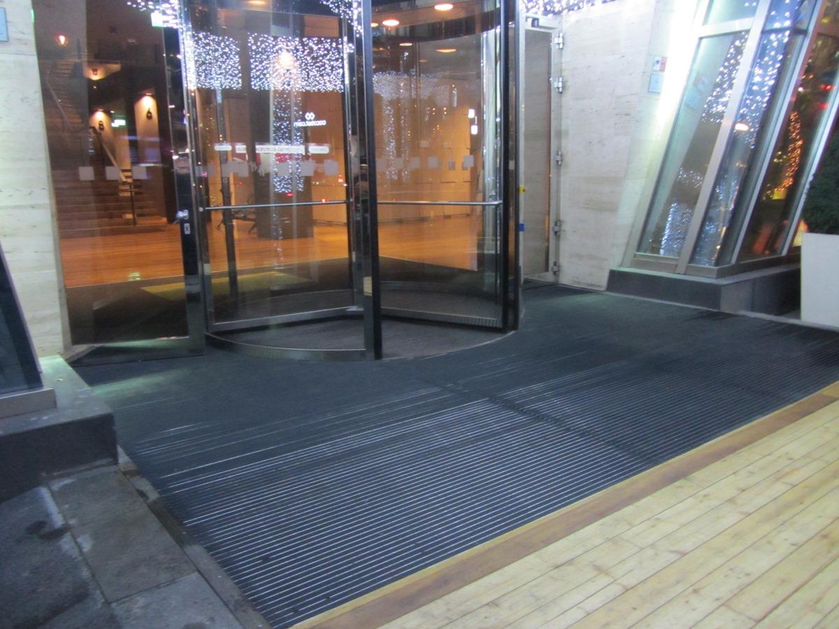 ცენტრალური შესასვლელის გარე პერიმეტრზე დაიგო ფეხსაწმენდი სისტემა EMCO Diplomat 517G რეზინის ჩანართებით.