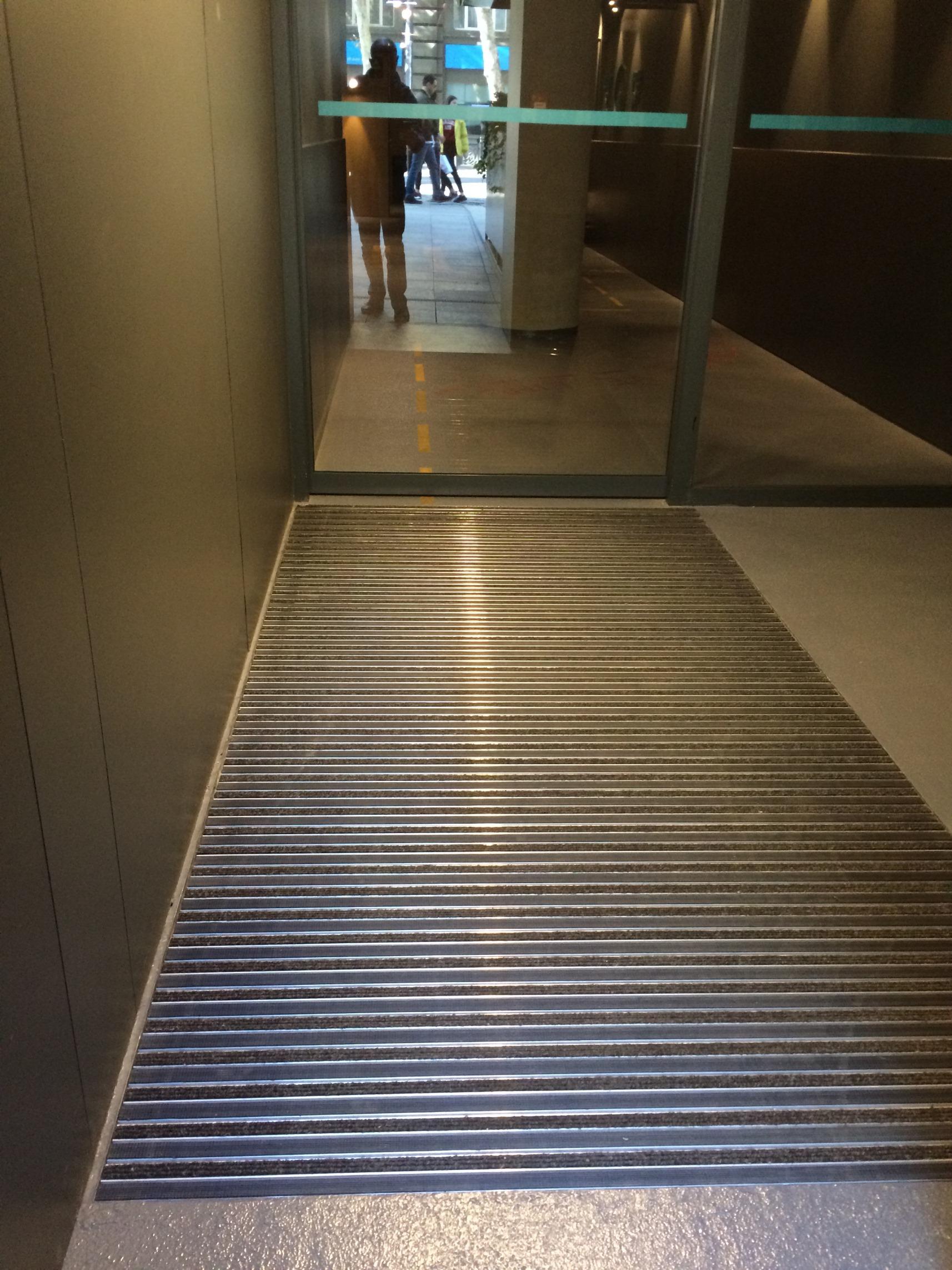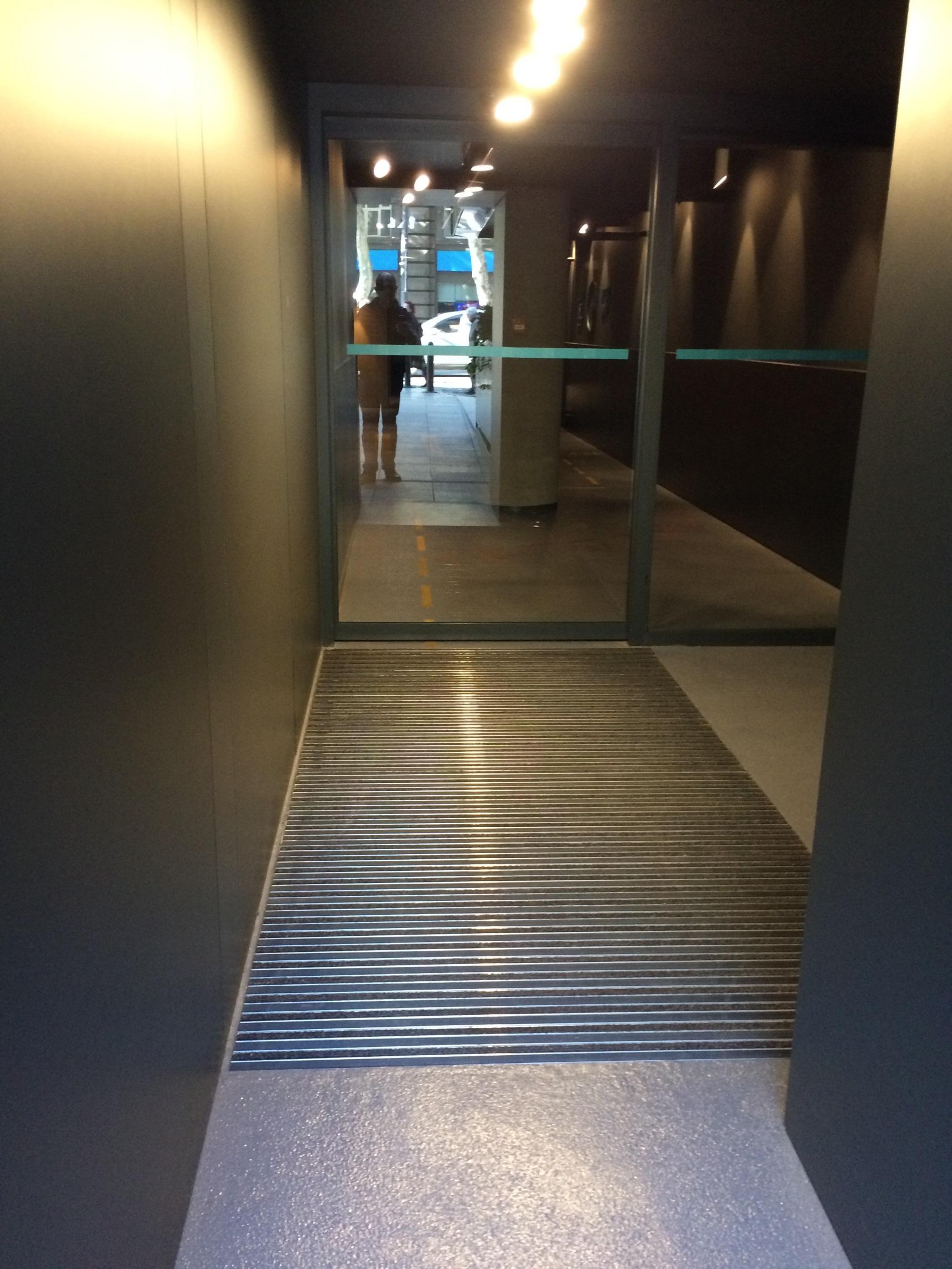 ცენტრალურ შესასვლელში გამოყენებულია ფეხსაწმენდი ალუმინის სისტემა EMCO Diplomat 522RG.